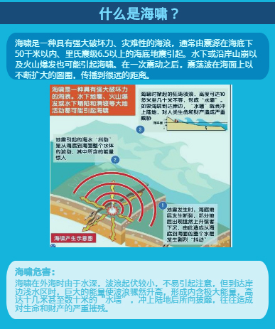 海啸是一种具有强大破坏力、灾难性的海浪,通常由震源在海底下50千米以内、里氏震级6.5以上的海底地震引起。水下或沿岸山崩以及火山爆发也可能引起海啸。在一次震动之后,震荡波在海面上以不断扩大的圆圈,传播到很远的距离。