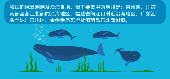 风暴潮是发生在海洋沿岸的一种严重自然灾害,来自高纬度地带的冷空气与来自海上的热带气旋通过交互影响,使沿海大风与巨浪接连发生,因此形成风暴潮。我国的风暴潮遍及沿海各地,但主要集中的地段是:莱州湾、江苏南部至浙江北部的沿海地区、福建省闽江口附近沿海地区、广东汕头至珠江口地区、雷州半岛东岸及海南岛东北部沿海。