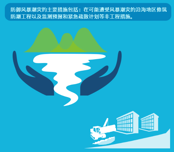 防御风暴潮灾的主要措施包括:工程措施以及监测预报和紧急疏散计划等非工程措施。工程措施是指在可能遭受风暴潮灾的沿海地区修筑防潮工程。位于黄河三角洲的胜利油田和东营市政府投入巨资,兴建几百公里的防潮海堤。但限于国力,现有的不少海堤、海塘标高仍然偏低,不少岸段工程质量不高,维护保养也跟不上,防御潮灾的工程措施亟待加强。