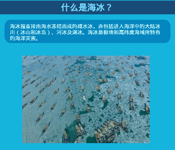 海冰指直接由海水冻结而成的咸水冰,亦包括进入海洋中的大陆冰川(冰山和冰岛)、河冰及湖冰。海冰是极地和高纬度海域所特有的海洋灾害。在北半球,海冰覆盖面积具有显著的季节变化,以3~4月最大,8~9月最小。漂浮在海洋上的巨大冰块和冰山,会对海上的石油平台和船只产生灾难性的影响。据计算一块6公里见方,高度为1.5米的大冰块,在流速不太大的情况下,其推力可达4000吨。