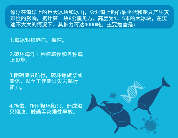 我国渤海和黄海北部海冰灾害的发生比较频繁。根据资料统计,严重的和比较严重的海冰灾害大致每5年发生一次,而局部海区出现海冰灾害几乎年年都有发生。我国海冰的主要危害是: