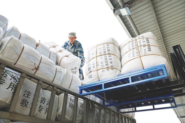 12月5日,鄂东南(黄冈)应急救援基地物资储备库,救助物资被整齐码放装车。