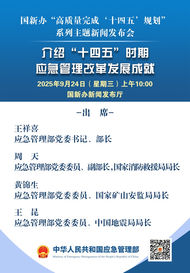 国务院新闻办公室定于2025年9月24日(星期三)上午10时举行“高质量完成‘十四五’规划”系列主题新闻发布会,应急管理部党委书记、部长王祥喜,应急管理部党委委员、副部长、国家消防救援局局长周天,应急管理部党委委员、国家矿山安监局局长黄锦生,应急管理部党委委员、中国地震局局长王昆将出席,介绍“十四五”时期应急管理改革发展成就,并答记者问。