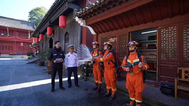 在紫霄宫广场,武当山消防救援大队队长徐涛展示了现代消防装备:“这是吸气式感烟探测器,它不光能监测烟雾,灵敏度是普通报警器的几倍,哪怕殿内有微弱火星,它都能第一时间捕捉。”