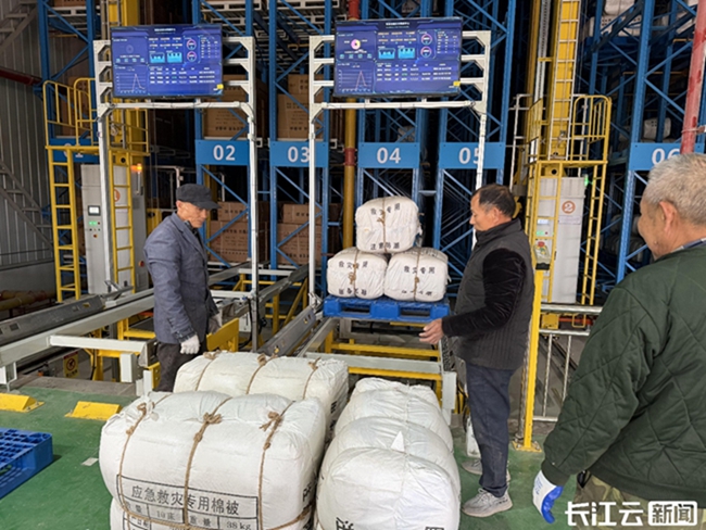 12月5日,在湖北咸宁省级救灾物资储备区域库内,一床床崭新的棉被、一件件厚实的棉衣被有条不紊地装上悬挂着暖心横幅的运输车。这些救灾物资正迅速运往全省各地,确保155.01万名受灾困难群众安全、温暖过冬过节。