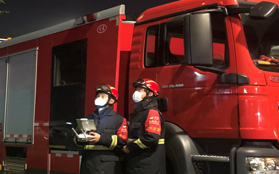泉州石化队侦察组队员操作无人机侦察事故现场