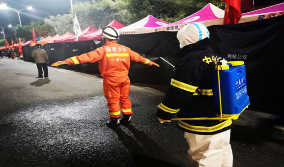 泉州石化队洗消组队员对参加救援消防人员进行洗消