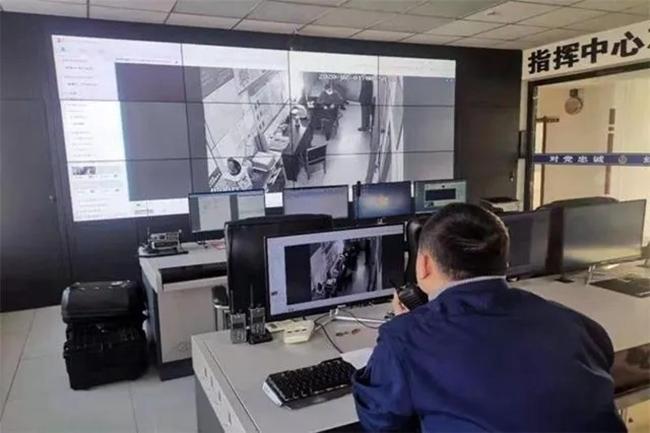 四平市消防救援支队辽河垦区大队防火监督员利用远程监控系统和微型消防站手台抽查单位消防安全工作情况。