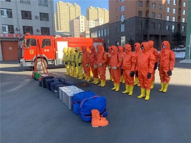 长春消防救援支队新区大队开展疫情防治期间消防救援演练。