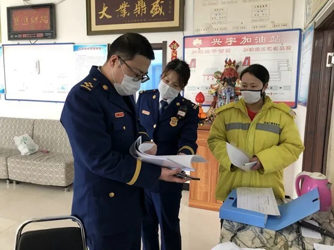 四平市消防救援支队梨树县大队防火监督员深入石油化工类重点单位检查消防巡查和器材装备完好情况。