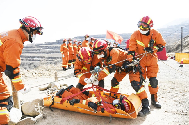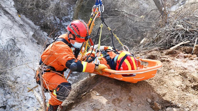 麻家寺村地处山区,山路蜿蜒曲折,地形陡峭,山间沟壑积雪未消。在历时十余个小时的鏖战中,各支队充分利用复杂地形,因势开展废墟搜索、攀爬横渡、深井救援、顶撑稳固等15个训练科目。
