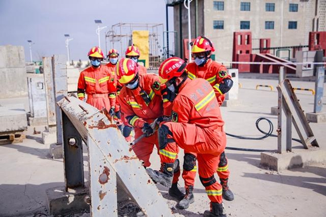 新区支队结合救援现场实际,分别开展废墟搜索救援、绳索T型救援、L型支撑加固救援科目。