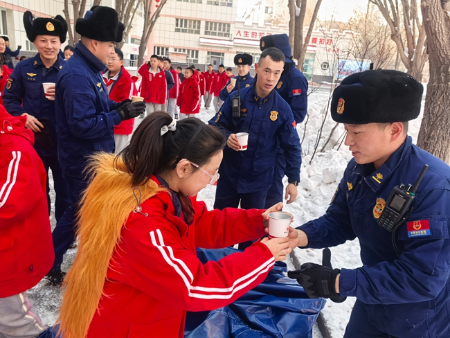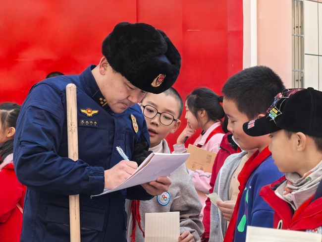 暖心的互动还在延续。得知指战员们的付出,老师带着学生们特意端来热水;课间时分,学生们抱着笔记本、攥着彩笔围拢过来,“消防员叔叔能写句‘好好学习’吗?”“我想让您写‘注意安全’!”稚嫩的请求此起彼伏。指战员们俯身落笔,一句句鼓励的话语跃然纸上,孩子们的笑脸与“火焰蓝”的身影相映成画,将冬日的寒冷酿成了最甜的温暖。