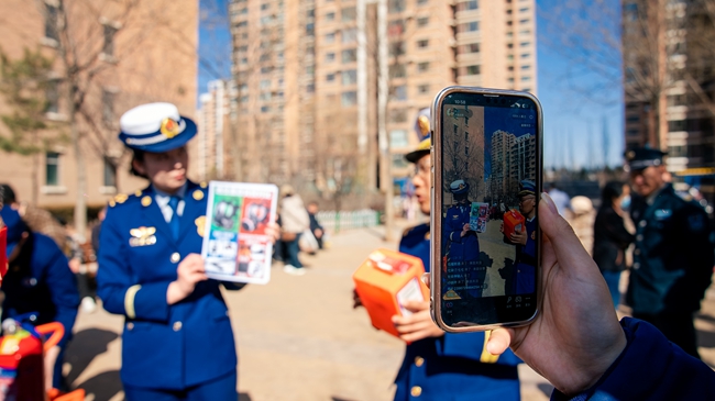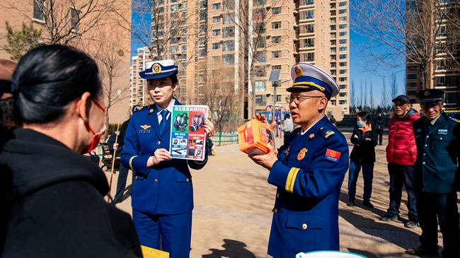 “您看,这个正规灭火器的压力表指针在绿区,标识清晰,还有独一无二的‘身份证’;而这个不正规的,标识模糊,扫码也查不到信息。”为将消防安全知识送到群众身边,联合宣传组将宣传阵地前移至人员密集的社区广场,设立了消防产品宣传咨询台。活动现场,“蓝朋友”们化身“讲解员”,将真假两种灭火器、应急照明灯、消防水带、防烟面罩等实物进行对比展示,不少群众拿出手机,按照讲解的步骤现场扫码验证,对这种“看得见、摸得着、学得会”的科普方式赞不绝口。结合春季火灾特点,宣传人员普及了家庭安全用火用电用气、电动车规范停放充电、初起火灾扑救及火场逃生自救等消防安全常识。