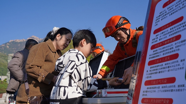 “今年1月1日我们国家正式施行的《森林草原防灭火条例》,这就是专门管森林草原防灭火的行政法规……”在泰山景区入口的科普宣讲区,指战员摆起了“特殊摊位”,以“唠家常”“答疑问”“讲案例”的方式向过往游客详细讲解森林防火的重要性、野外用火的危害,以及《条例》中关于野外用火的禁令及违法成本。