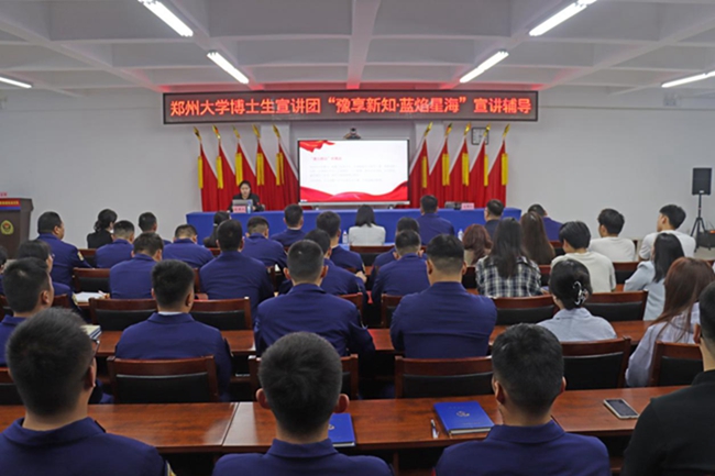 被誉为“超强知识天团”的郑州大学博士生宣讲团,始终坚持用青年视角阐释党的创新理论。“行走中原”红色精神宣讲团讲师贾文珍带来专程为支队精心准备的一课《弘扬河南四种红色精神,汇聚中原奋进力量》,从大别山精神到焦裕禄精神,从红旗渠精神到愚公移山精神,四种精神如座座灯塔照亮中原。