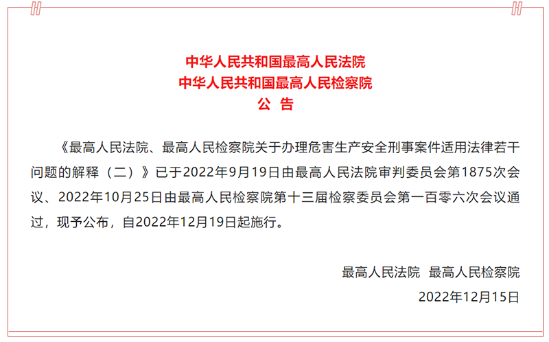 12月15日,最高人民法院、最高人民检察院联合发布《关于办理危害生产安全刑事案件适用法律若干问题的解释(二)》(法释〔2022〕19号,以下简称《解释》)。《解释》于2022年9月19日由最高人民法院审判委员会第1875次会议、2022年10月25日由最高人民检察院第十三届检察委员会第一百零六次会议通过,自2022年12月19日起施行。