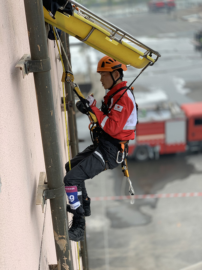 高空悬吊向下救援科目中,队员们正准备救援伤员